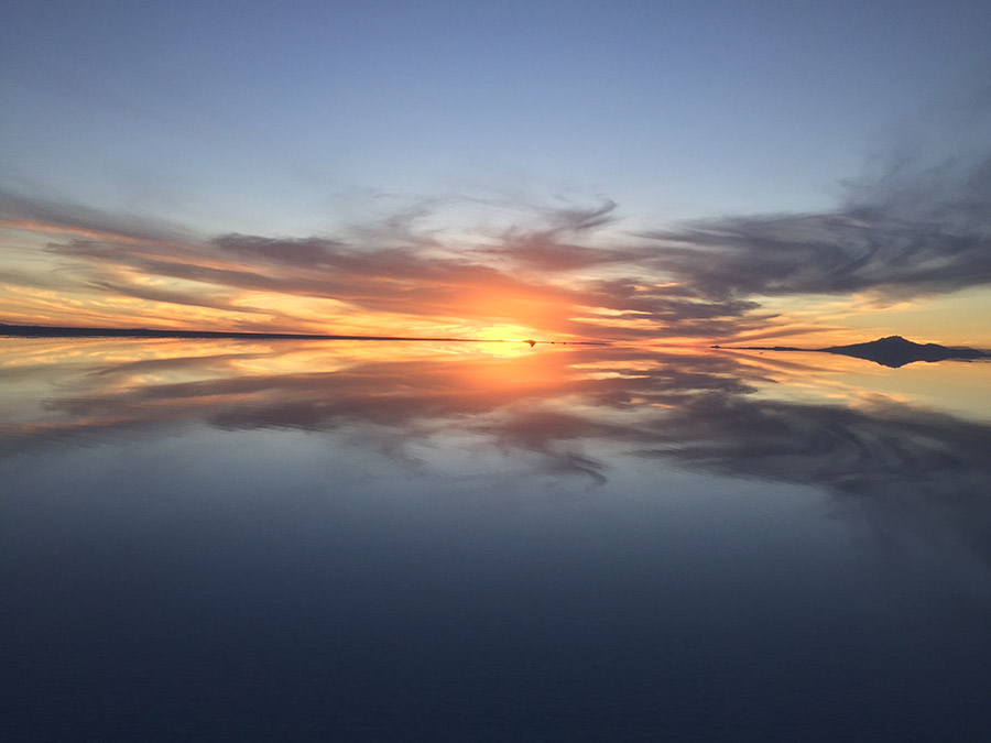 The third thing the Salar has to offer is the best of the three. After it rains, the water accumulates a few inches deep on the utterly flat salt plains, forming a perfect mirror reflecting everything above it.
